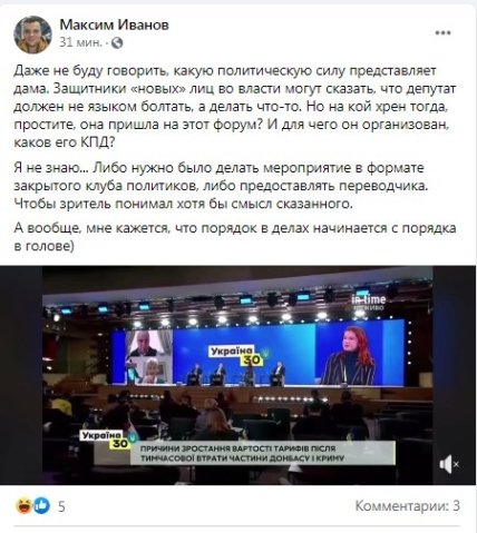 В понедельник, 15 февраля, в Киеве стартовал трехдневный Всеукраинский форум "Украина 30. Платежка", где знатно оконфузилась народный депутат Украины от "Слуги народа", заместитель председателя комитета ВРУ по вопросам национальной безопасности Марьяна Безуглая, которая рассуждая о причинах роста стоимости тарифов после временной потери части Донбасса и Крыма, не смогла связать ни слова.
