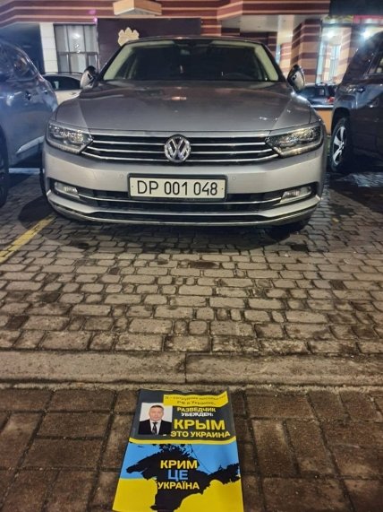 Помимо этого, на автомобили посольства РФ в Украине наклеили трезубцы.