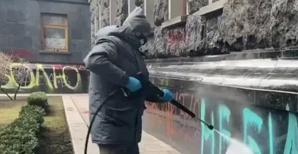 В понедельник, 22 марта, здание Офиса президента начали отмывать от надписей, нанесенных краской участниками беспорядков в субботу, 20 марта, произошедших у здания во время акции в поддержку осужденного активиста Сергея Стерненко.
