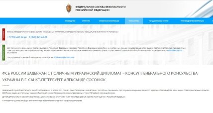 "…. задержан с поличным украинский дипломат - консул Генерального консульства Украины в Санкт-Петербурге Александр Сосонюк", - пишет издание со ссылкой на данные Центра общественных связей.