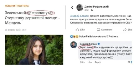 Учитывая заявления одесского активиста Сергея Стерненко о предложении Владимира Зеленского возглавить СБУ в Одессе и подтверждение бывшего главы ОП Андрея Богдана, который заявил, что такой разговор действительно был, пресс-секретарю президента Юлии Мендель припомнили заявления про то, что Зеленский Стерненко ничего не предлагал.