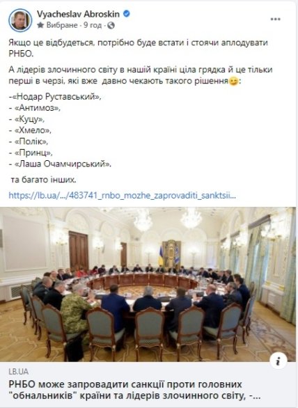 Как отметил ректор Одесского государственного университета внутренних дел, бывший первый заместитель главы МВД Арсена Авакова Вячеслав Аброськин в Facebook, комментируя введение санкций против криминальных авторитетов, "если это произойдет, нужно будет встать и стоя аплодировать СНБО".