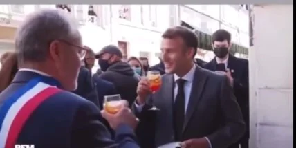 Улыбающийся Макрон во время посещения одного из парижских кафе, поднял бокал со словами "à ta santé!", что произвольно можно перевести как "Будьмо", а дословно как тост "Ваше здоровье!".