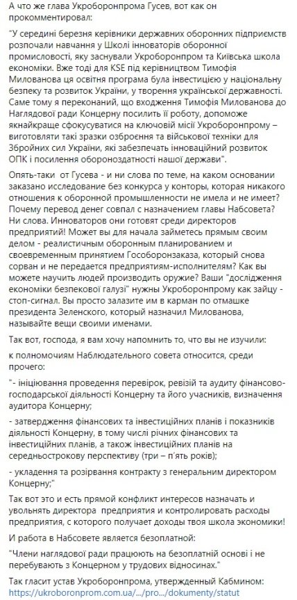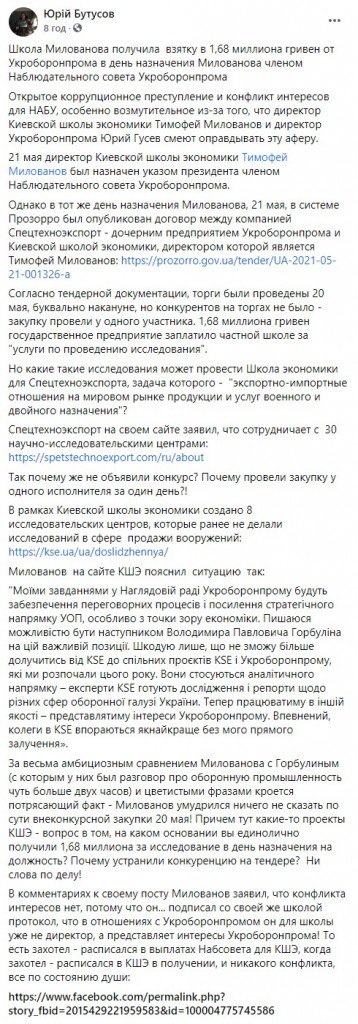 По его словам, школа Милованова получила взятку в 1,68 миллиона гривен от Укроборонпрома как раз в день его назначения членом Наблюдательного совета Укроборонпрома.