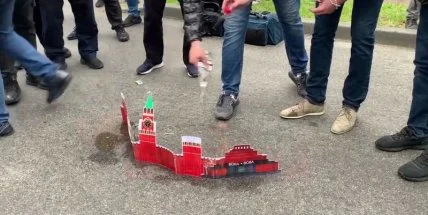 26 мая под посольством РФ в Киеве активисты провели акцию в память о погибших на Донбассе военных, в ходе которого был подожжена картонная фигурка, напоминающая Кремль.