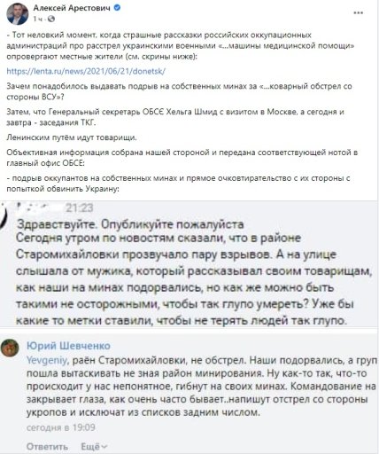 "Зачем понадобилось выдавать подрыв на собственных минах за "…коварный обстрел со стороны ВСУ"? Затем, что Генеральный секретарь ОБСЄ Хельга Шмид с визитом в Москве, а сегодня и завтра - заседания ТКГ. Ленинским путём идут товарищи", - пишет Арестович на своей странице в "Фейсбуке".