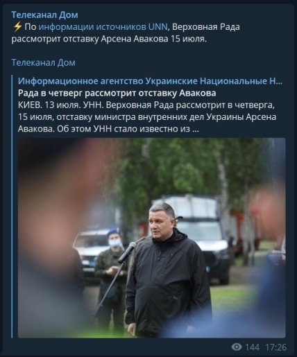 Косвенным подтверждением неминуемости того, что Аваков действительно может уйти, можно считать размещение информации в Telegram государственного телеканала "Дом", близкого к Офису президента.