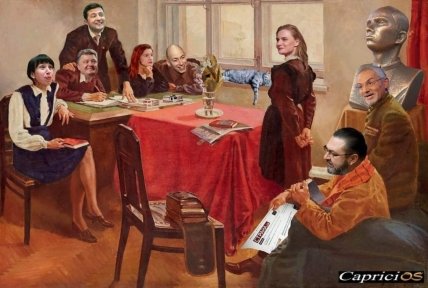 В Сети появилась пародия на картину советского художника Сергея Григорьева "Прием в комсомол", написанную в 1949 году. Однако на месте девочки, которую торжественно принимают в организацию, - украинская журналистка Светлана Крюкова, а в числе зачисляющих в комсомол - нынешний президент Украины Владимир Зеленский, пятый президент Петр Порошенко, журналисты Дмитрий Гордон и Татьяна Черновол, телеведущий Савик Шустер и другие.