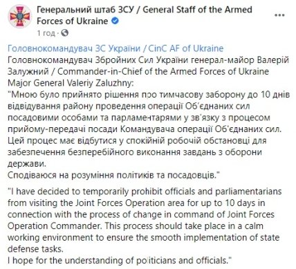 "Было принято решение о временном запрете до 10 дней посещения района проведения операции Объединенных сил должностными лицами и парламентариями в связи с процессом приема-передачи должности командующего операции Объединенных сил. Этот процесс должен состояться в спокойной рабочей обстановке для обеспечения бесперебойного выполнения задач по обороне государства. Надеюсь на понимание политиков и чиновников", - заявил главнокомандующий ВСУ Валерий Залужный.