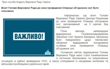 Спикер Верховной Рады Дмитрий Разумков отменил поездку на Донбасс, куда планировал отправиться во вторник, 3 августа, из-за внезапного запрета должностным лицам Украины посещать зону проведения операции Объединенных сил (ООС).