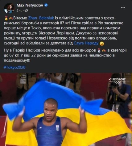 Между тем, не только коллеги по парламенту поздравили Беленюка с победой и "золотом".