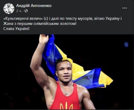 "Культивируя величие" (с) и далее по тексту мусоров, поздравляю Украину и Жана с первым олимпийским золотом! Слава Украине!", - так поздравил Беленюка с победой один из подозреваемых в убийстве журналиста Павла Шеремета ветеран АТО и музыкант Андрей Антоненко.