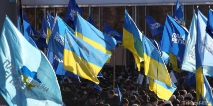 Сторонники "Партии регионов" организованными колонами подходят к месту проведения митинга у Верховной Рады.