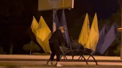 В Запорожье девушка сняла с флагштока два флага с государственной символикой на центральном проспекте. Событие произошло ночью, а видео сняла подруга.
