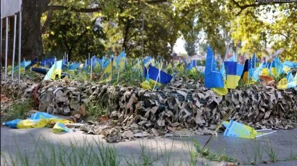 В Запорожье повредили пространство памяти по погибшим украинским воинам. Часть флажков с именами погибших героев и их портреты исчезли.