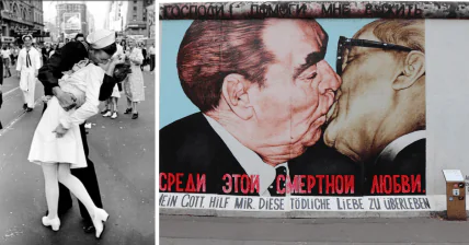 Фото поцелуя сделал Регис Босс, оно прославилось на весь мир благодаря граффити "Боже мой, помоги мне пережить эту смертельную любовь" на Берлинской стене. Сейчас сфотографироваться вокруг удивительной памятки приезжают туристы со всего мира. Для справедливости скажем, что рядом есть и другие граффити. Авторские права на фотографию принадлежат корпорации Corbis.