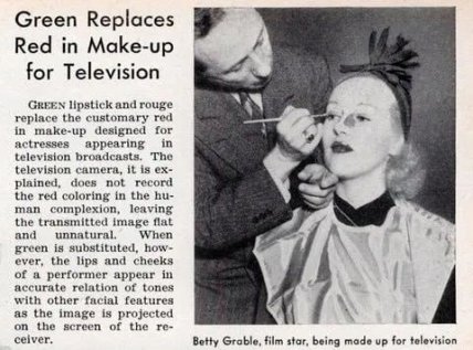Дело в том, что тогда в камерах были красные фильтры, фактически съедавшие весь красный цвет. Поэтому во времена черно-белых экранов ведущие окрашивались зеленой помадой и использовали зеленые румяна. На картинке этот цвет выглядел естественно и выразительно.