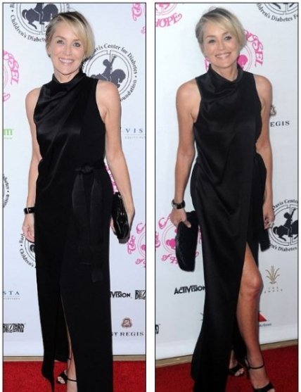 58-летняя Шэрон Стоун появилась на красной дорожке, где вела себя легко и непринужденно, а ее черное облегающее платье обнажало ноги актрисы сквозь приличный разрез. Шэрон привлекала внимание фотографов еще и босоножками на высоком каблуке.