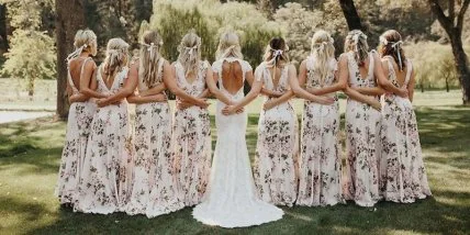 В свадебных церемониях полно разнообразных традиций: бросание букета / подвязки, поцелуй, обмен кольцами и т.д. Уже приличное количество времени назад в моду также вошли свадебные фотосессии с подружками невесты, а там где есть фотосессии, всегда найдется место для моды. Если невеста по традиции должна быть одета в белое, а меняться может только фасон платья, то в плане нарядов её подружек всё куда более свободно. До недавнего времени среди подружек невесты было принято надевать однотонные платья различных цветов, но им на смену пришли цветочные платья. Платья подружек невесты, украшенные цветами, являются самым последним свадебным трендом, идеально подходящим для свадеб проходящих весной и летом. Яркие мотивы, деликатные цвета и целые натюрморты на цветочных платьях подружек невест ждут вас далее.