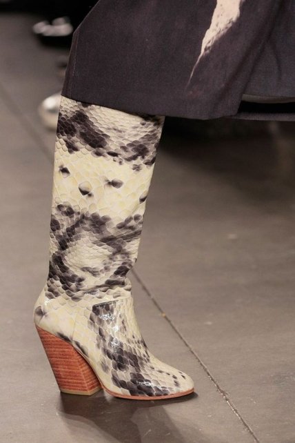 В моде стабильно держится анималистический принт - от полоски зебры и леопардовых пятен до раскраски пресмыкающихся. Самые полюбившиеся жители модной фауны - змеи и крокодилы. В осенне-зимнем сезоне 2018-2019 в тренде сапоги как натуральных оттенков, свойственные природным цветам пресмыкающихся, так и безумные зеленые, красные, синие, розовые модели.