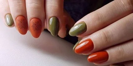 Например, однотонное матовое покрытие, лунный маникюр или цветной французский маникюр. Если уж очень хочется рисунок на ногтях, то лучше декорировать один ноготок с помощью аппликации или росписи на осеннюю тематику.