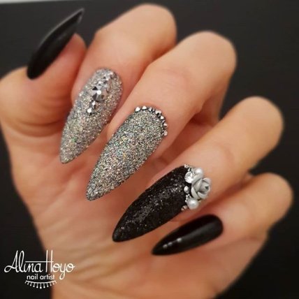 Для вечеринок и других праздничных мероприятий можно воспользоваться различными декоративными элементами, которые смогут дополнить и украсить необычный длинный маникюр.
