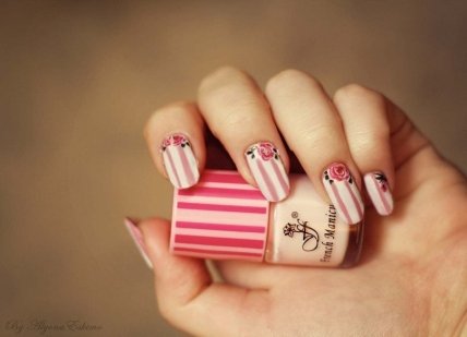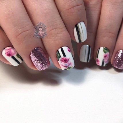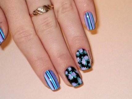 На первый взгляд полосатый маникюр с использованием флористического рисунка может показаться несовместимым дизайнерским решением. Но современные дамы не бояться экспериментировать.