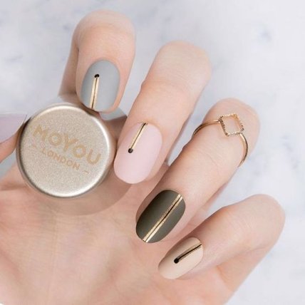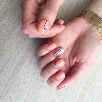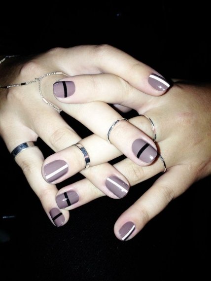 Если вы экспериментируете и ищите универсальный, не перегруженный дизайном стиль, то выберите полосатый маникюр в стиле минимализм. Неброские полоски на основе нейтрального цвета выглядят очень нежно и эффектно.