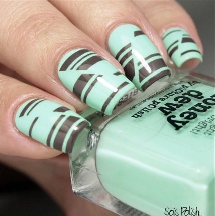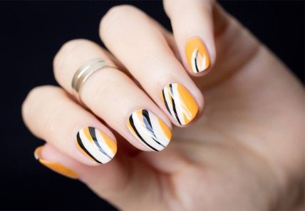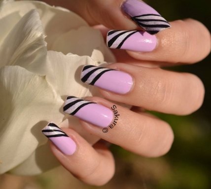 Например, зигзаги, горизонтальные или вертикальные полоски, а так же их оригинальное сочетание поможет создать интересный и современный маникюр.