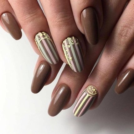 В создании такого маникюра замечательно и смело будет выглядеть сочетание различных фактур и цветовых решений. Такой полосатый маникюр — это современное решение в дизайне ногтей, которое выглядит очень красиво ярко и необычно.
