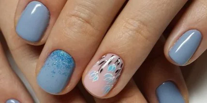 Стильный голубой маникюр, дополнительно декорированный блестками, предназначен для создания яркого, мерцающего образа. Как правило, такой нейл-арт делают перед клубной вечеринкой, днем рождения или неофициальным торжеством, однако, лаконичный блестящий дизайн может найти свое место и в деловой или повседневной жизни. Деловые женщины обыкновенно покрывают все ноготки нежно-голубым лаком или гель-лаком, а акцентные пальчики выделяют серебристыми блестками, которые превосходно сочетаются с холодным оттенком.