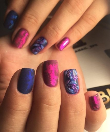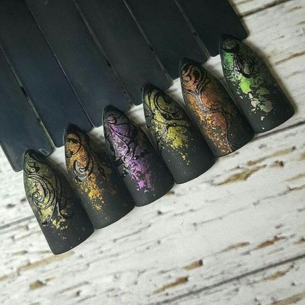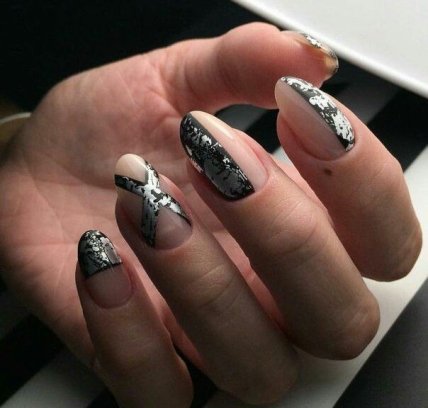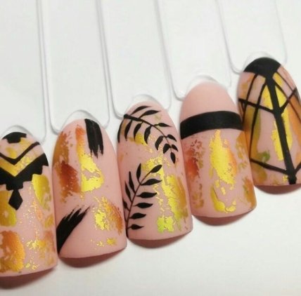 Интересный и стильный получается маникюр, если одновременно использовать несколько приемов. Модный маникюр с фольгой в сочетании с рисунками смотрится оригинально и современно. Можно прибегать к нанесению на гель-лак росписи и фольги, дополнить графическими мотивами или наклейками слайдерами. В совокупности это позволяет в домашних условиях получить непревзойденный дизайн с фольгой.