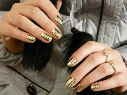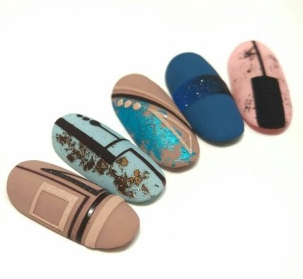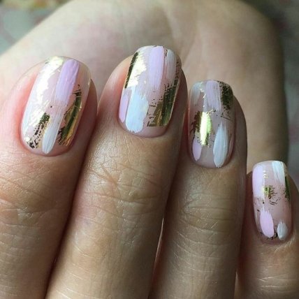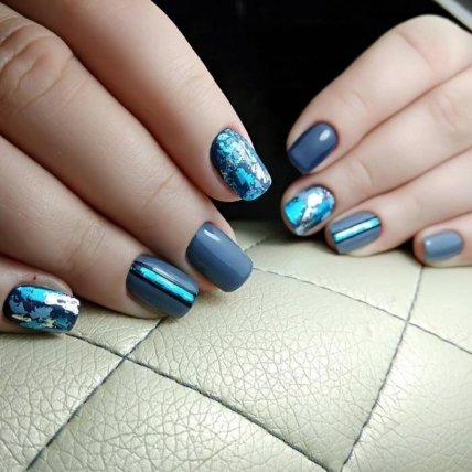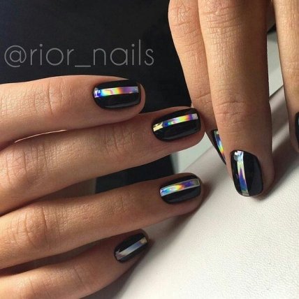 Многие девушки видели фото дизайна, получившего название маникюр "битое стекло". Его можно дополнить геометрическими узорами. Прекрасным вариантом будет вырезать из фольги разные фигурки геометрической формы. Маникюр с полосками из фольги выглядит стильно и мегамодно. Данный вариант идеально подходит как для вечернего мероприятия, так и деловой встречи или работы в офисе, где требуется придерживаться строгого дресс-кода.