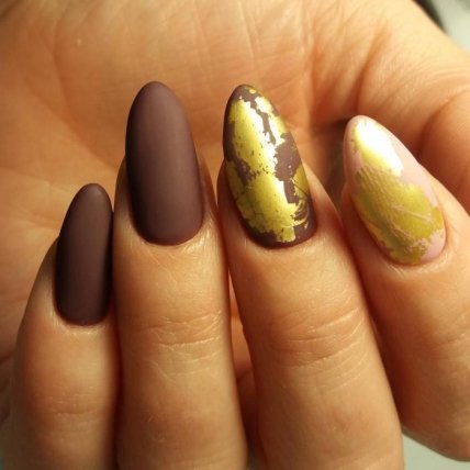 Модный маникюр 2019 должен выполняться с использованием специальной матовой фольги. Ноготки будут смотреться роскошно, внешним видом напоминая дорогой и изысканный бархат. Если дополнить дизайн блестящим декором, будут заметны все достоинства данного варианта.