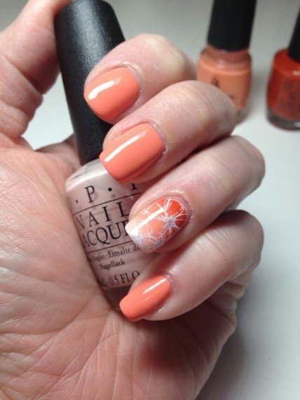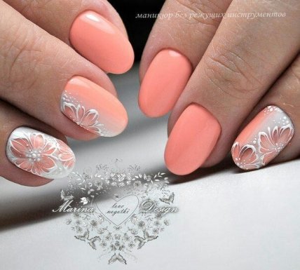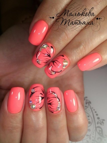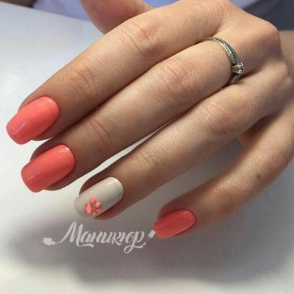 Романтичный вариант на все времена, который можно увидеть в различных интерпретациях. Цветы могут быть крупными или наоборот небольшими, украшать 1-2 пальца. С коралловым лаком отлично сочетаются контрастные мотивы, но если вам хочется окружить себя аурой нежности, то попробуйте нарисовать цветы в акварельной технике. Такой маникюр в коралловых цветах станет прекрасным украшением на длинные и на короткие ногти.