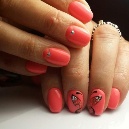 Универсальный вариант, который придется по душе всем поклонницам маникюра кораллового цвета. Тема может быть выбрана абсолютно любая, нет никаких ограничений. Все зависит от ваших желаний и предпочтений. Это могут быть сложные рисунки, с четкой прорисовкой всех деталей или же наоборот простые. Для лета можно выбрать "попсовые" мотивы: сладости, фрукты, ягоды, мультяшных героев. Актуальна и геометрия, ажурные орнаменты и узоры.