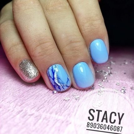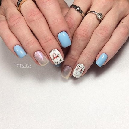 Идеи зимнего маникюра в нежных оттенках голубого и белого цветов.