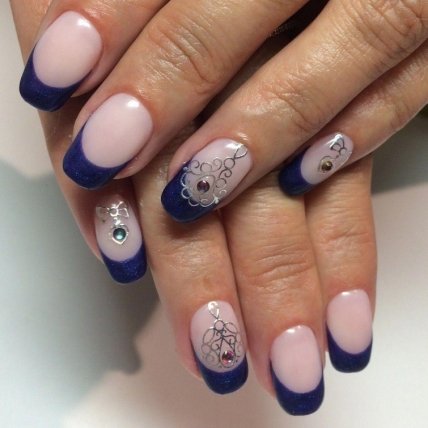Конечно, французский маникюр для встречи Нового года не обязательно должен соответствовать всем канонам классики. Во-первых, вы можете отойти от традиционной белой улыбки в паре с бежевой или нежно-розовой пластиной.
