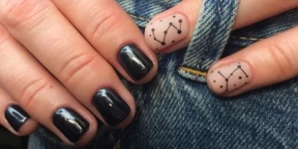 Выберите основной цвет ногтей, а один пальчик прокрасьте полупрозрачной основой. Минималистические рисунки смогут разнообразить ваш маникюр!