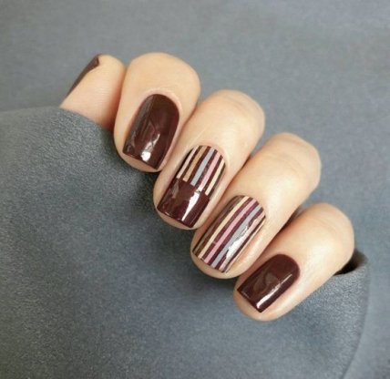 Дизайн маникюра на зиму 2019 должен сочетать насыщенность и лаконичность, ведь он более "спокойный". Используйте "кофейную" гамму оттенков, которую еще часто называют нюдовой (nude). Секретный элемент - тонкие серебряные полоски в форме полумесяца.