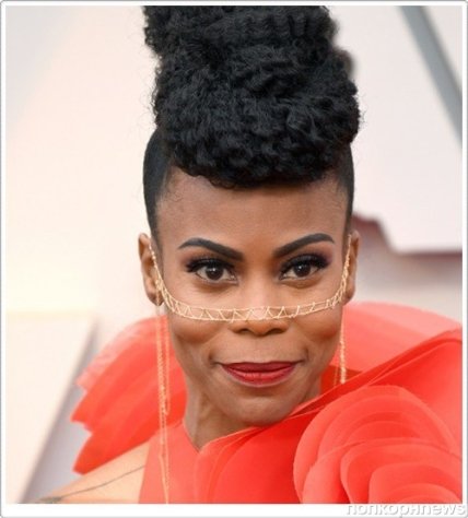 Одно из самых необычных украшений на "Оскаре" становится вполне понятным, если учесть, кому оно принадлежит: женщина на фото - Ханна Бичлер, получившая "Оскар" как лучший художник-постановщик за работу над красочной экзотикой "Черной пантеры"