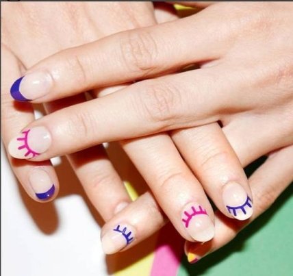 Макияж глаз с цветной тушью – один из главных летних трендов, который можно поддержать и в маникюре. Подчеркните лунку или кончик ногтя изображением ярких ресниц, будто накрашенных розовой или синей тушью, как на фото ниже.