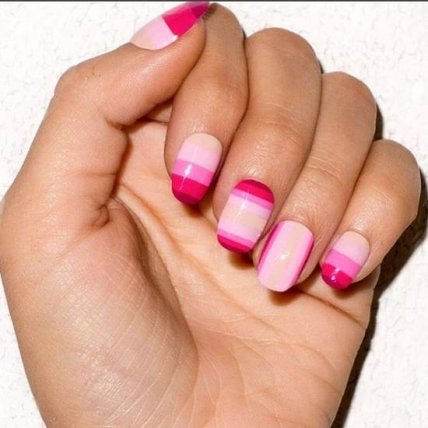 Нанесите две-три яркие полоски на прозрачную основу или закрасьте толстыми разноцветными линиями всю поверхность ногтевой пластины. Полосатый маникюр – в топе!