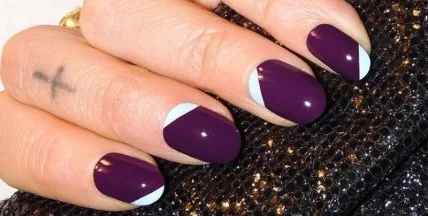 В наши дни кончики ногтей при френче необязательно выделять тонкой прямой белой линией. Нарушаем все законы сразу: пусть полоска будет широкой, ярко-голубой и скошенной!