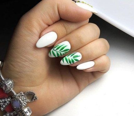 Ну куда же весной без зелени. если вы начинающий мастер, то вам наверняка должен понравится простой весенний маникюр с веточками зелени. Выполняется он очень легко. Сначала наносите на ноготь волнообразные линии с помощью кисти лайнера с длинным и тонким волоском, а потом берете кисть с коротким ворсом и прорисовываете листочки. При желании орнамент можно присыпать мерцающим песком или блестками. В зависимости от выбранного стиля, подбирается цветовая гамма.