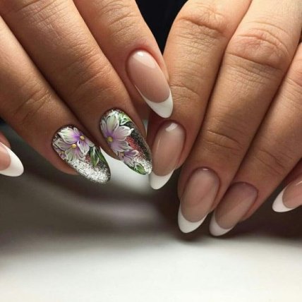 Безусловным трендом начала 2019 года в оформлении ногтей стали красочные рисунки в виде цветов, выполненные на сверкающем покрытии из блесток. Чтобы создать такой дизайн быстро, лучше использовать готовый гель-лак, наполненный блестками, только покрывать им ногти нужно тонкими слоями, чтобы не получилось слишком плотное и толстое покрытие, которое, как правило, мало носится и быстро отслаивается. Весенний маникюр с цветами и блестками любят выполнять в розовой, светло-зеленой, сиреневой или светло-голубой гамме.