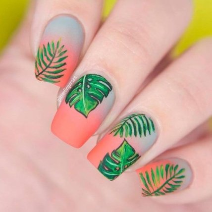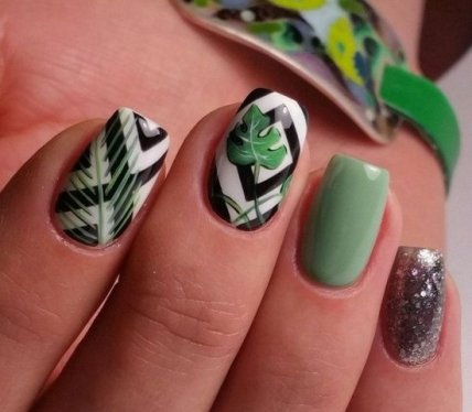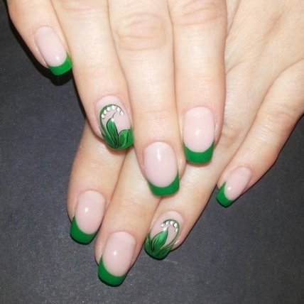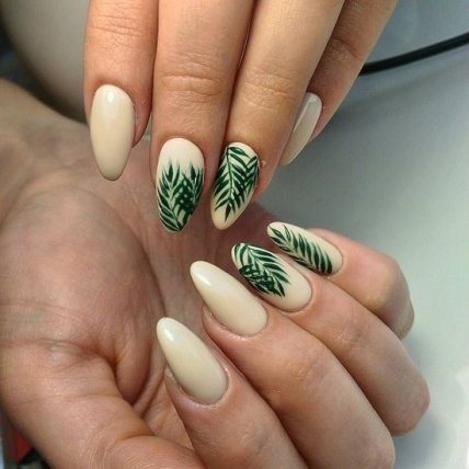 Ну куда же весной без зелени. Если вы начинающий мастер, то вам наверняка должен понравится простой весенний маникюр с веточками зелени. Выполняется он очень легко. Сначала наносите на ноготь волнообразные линии с помощью кисти лайнера с длинным и тонким волоском, а потом берете кисть с коротким ворсом и прорисовываете листочки. При желании орнамент можно присыпать мерцающим песком или блестками. В зависимости от выбранного стиля, подбирается цветовая гамма.