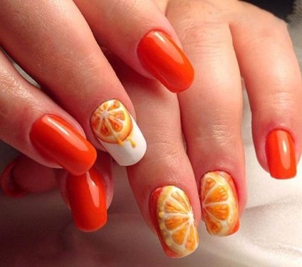 Яркий оранжевый маникюр может показаться вызывающим, если одежда не соответствует по цвету. Поэтому данный вариант надо выбирать лишь в случае, когда в гардеробе присутствуют оттенки цитрусов. Тогда маникюр дополнит образ, не выделяясь на общем фоне, а дополняя его. Сочные оттенки мандаринов и прочих цитрусовых – чудесный выбор для молодых и активных девушек.