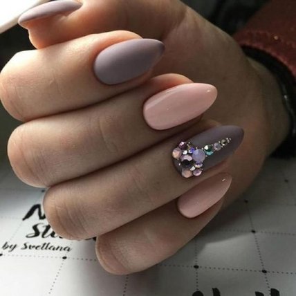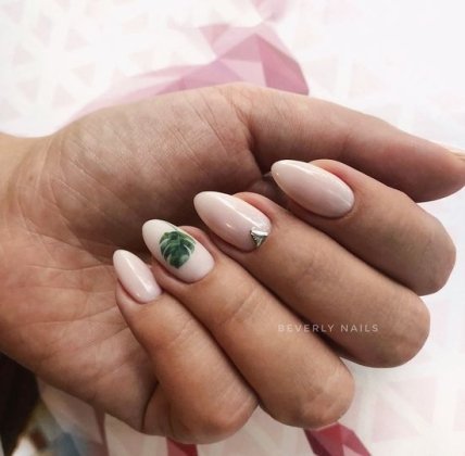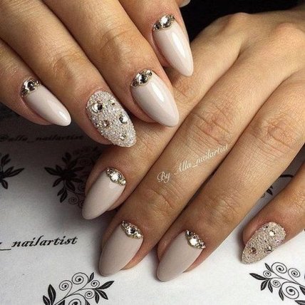 Пастельные естественные тона как всегда в моде. И как нельзя лучше эти оттенки смотрятся на ноготочках миндалевидной формы, придавая ручкам их представительницы особого изящества. Разнообразить нюдовый маникюр вам помогут стразы, минималистичные рисунки или другой, не слишком вычурный декор.