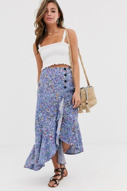 Если белые длинные юбки вам не по душе, то выберите другой вариант. Например, асимметричную юбку миди голубого цвета с воланами, пуговицами и цветочным принтом в винтажном стиле.